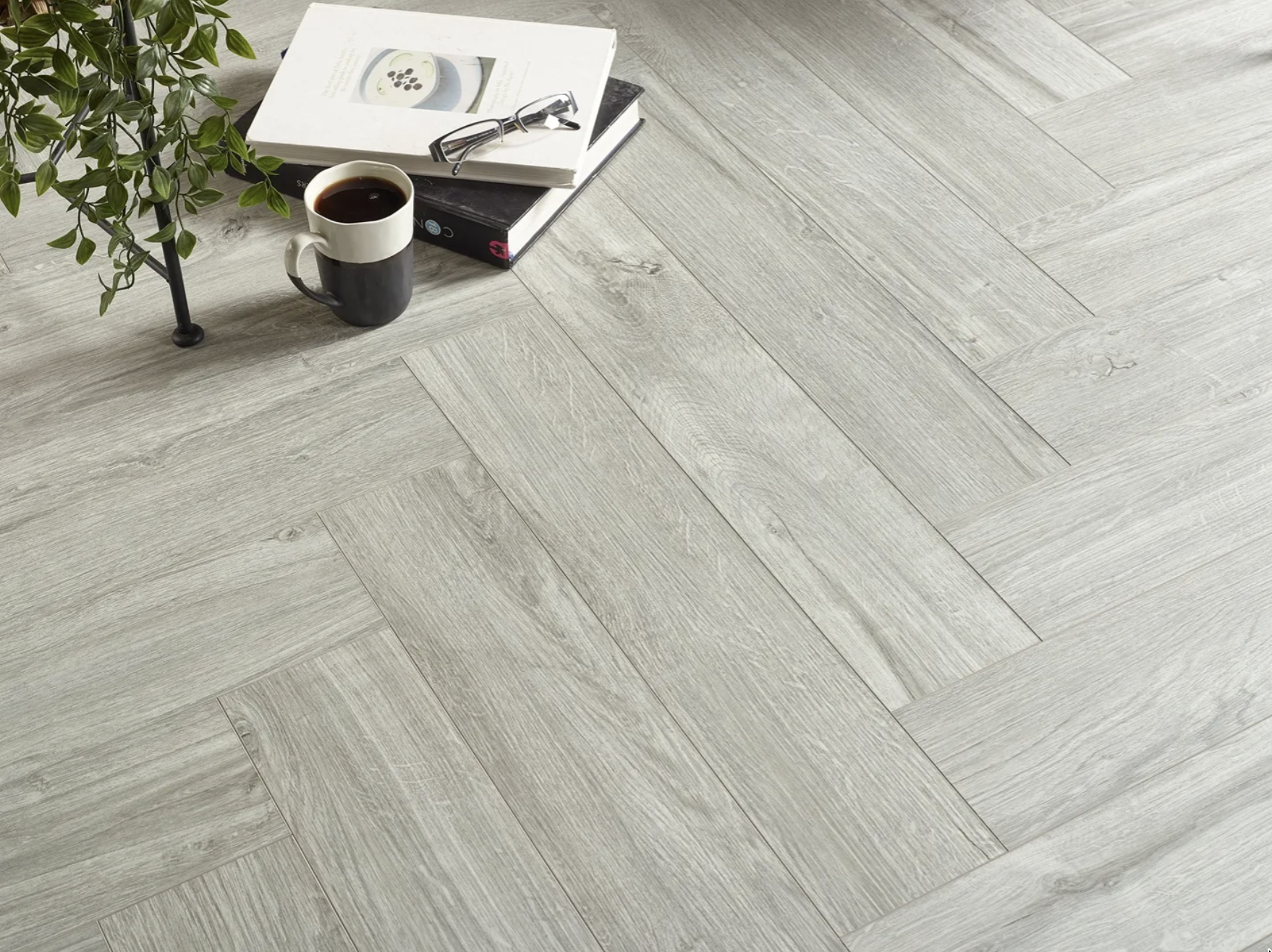 Light Grey – HYDRO Loc Rigid Core Herringbone SPC LVT blends fresh modern tones with a timeless pattern, making it a versatile flooring solution for any space.