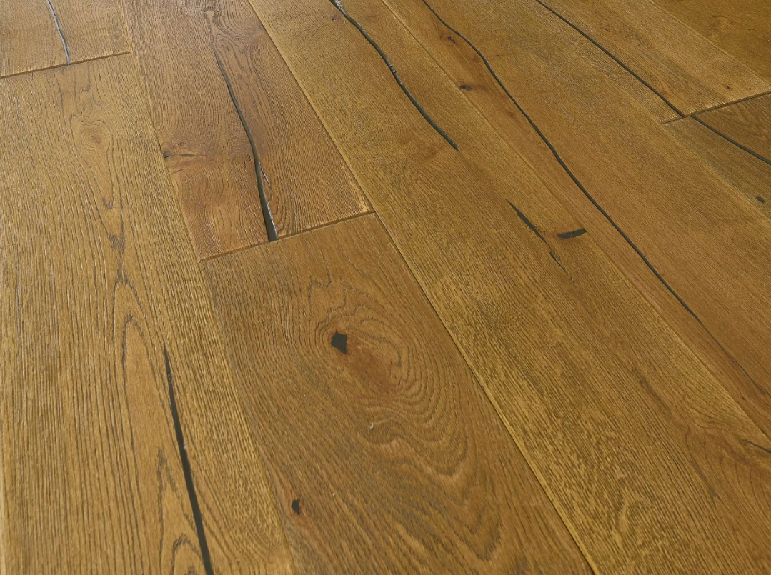 Make a bold statement with the 220 Golden Distressed (Hardwax Oil) engineered wood flooring. With its wide planks, rich golden tones, and hand-distressed texture, this floor exudes rustic charm and character. The hardwax oil finish enhances the wood’s natural grain while offering deep protection and a beautifully matte, lived-in look.